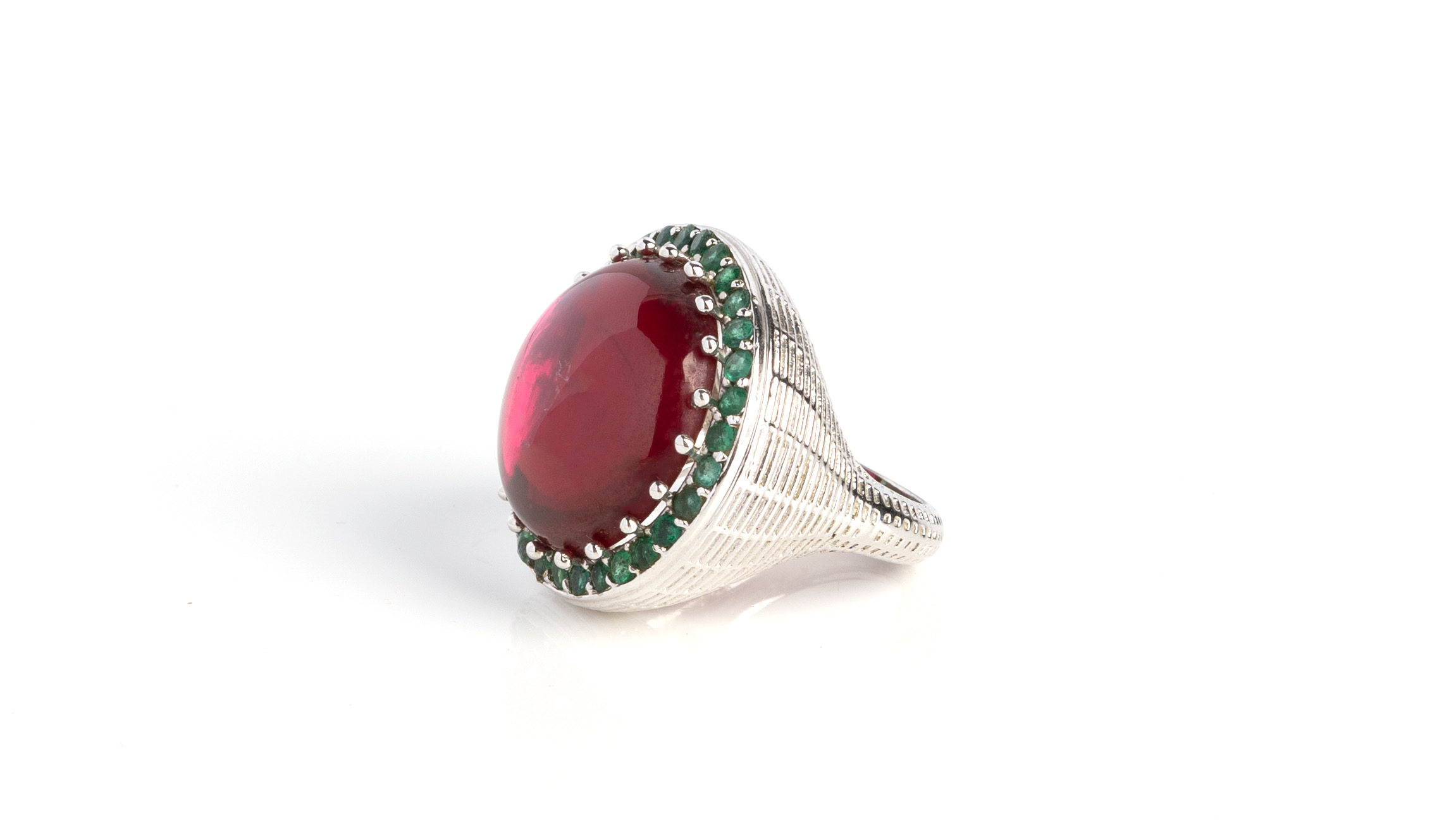 Pink stone And emeralds embedded in Silver ring with elegant designing.